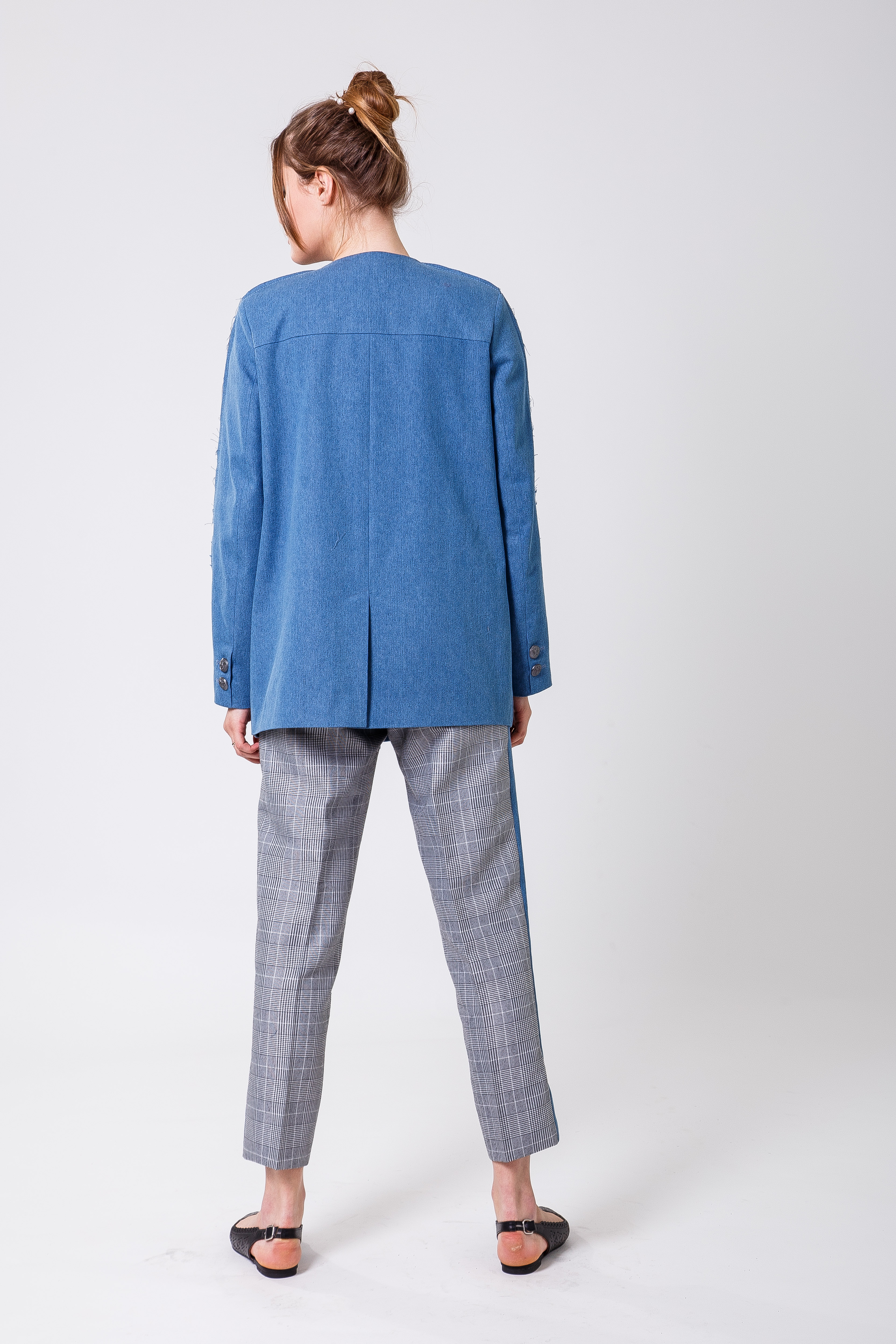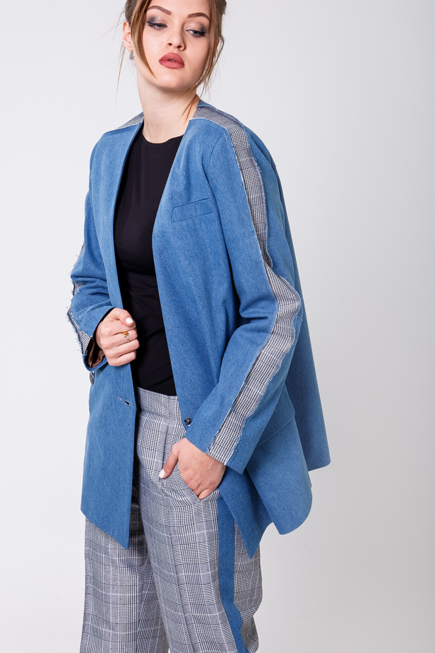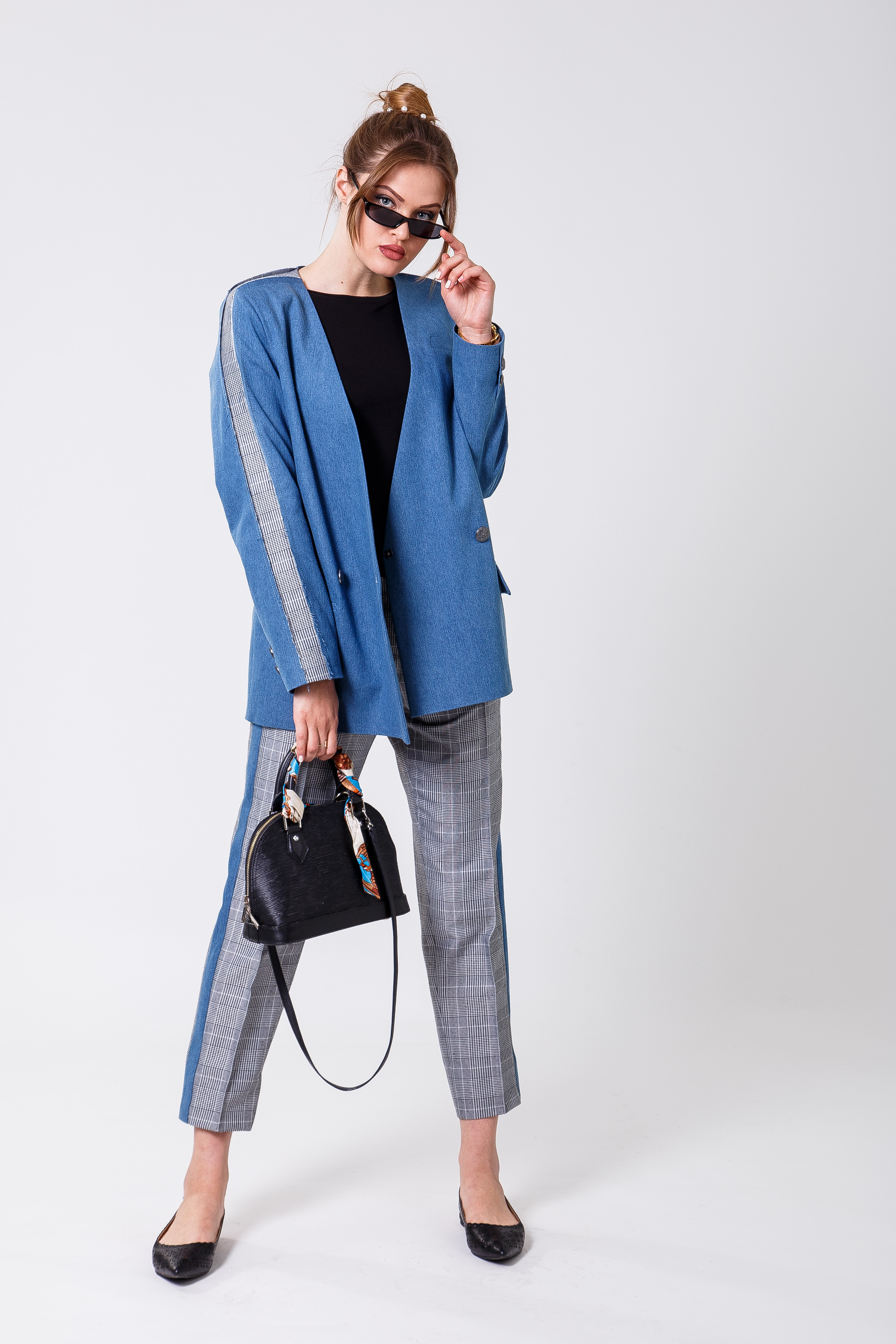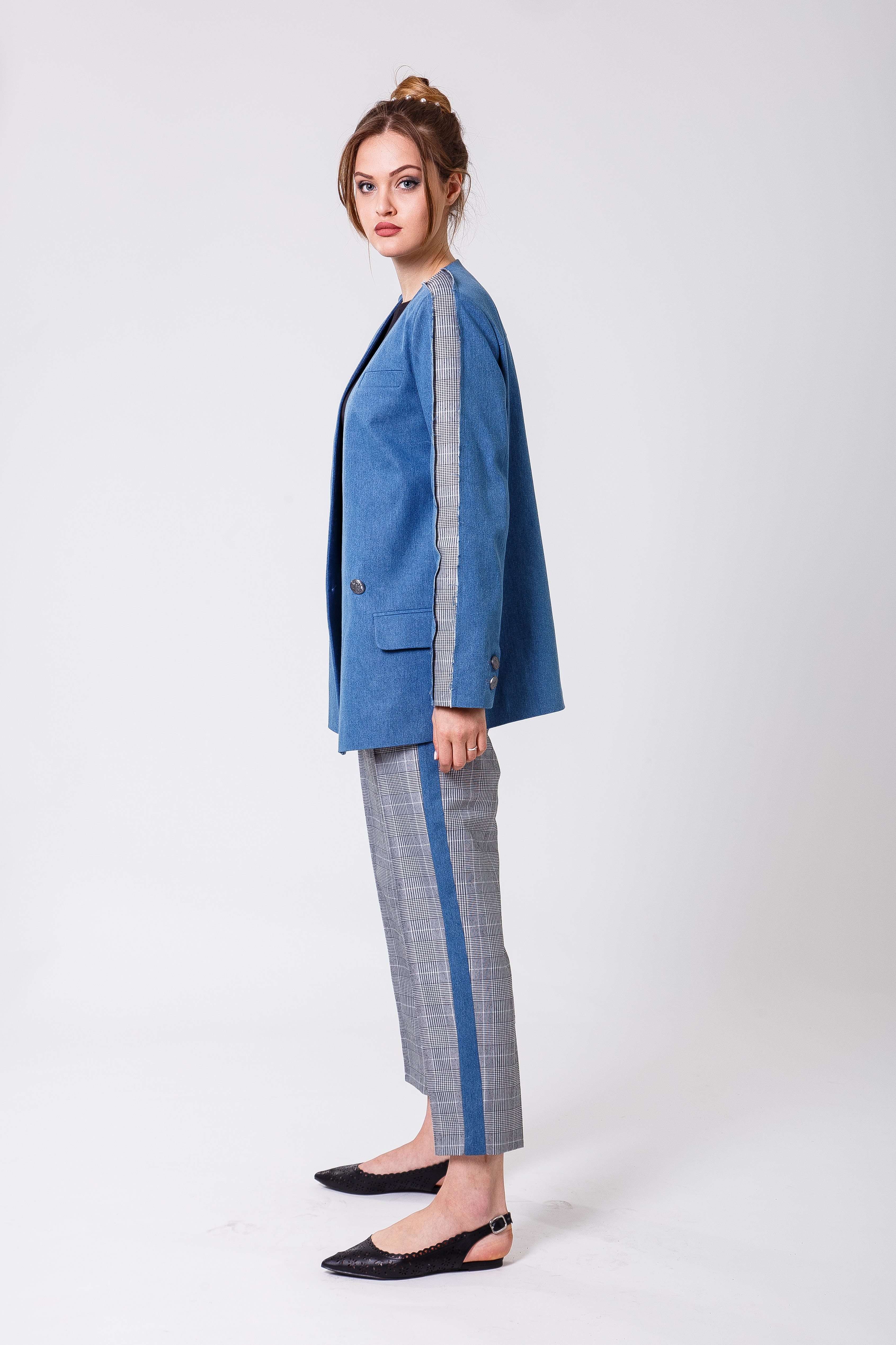 На ваш суд - прекрасный деловой комплект из двубортного блейзера без воротника и укороченных брюк. Респектабельно - под каблук, комфортно - под обувь на низком ходу. Очень привлекательны детали: лампасы и оригинальная отделка рукава. А небесный голубой оттенок верха отлично гармонирует с виндзорской клеткой низа. Элегантно и стильно.