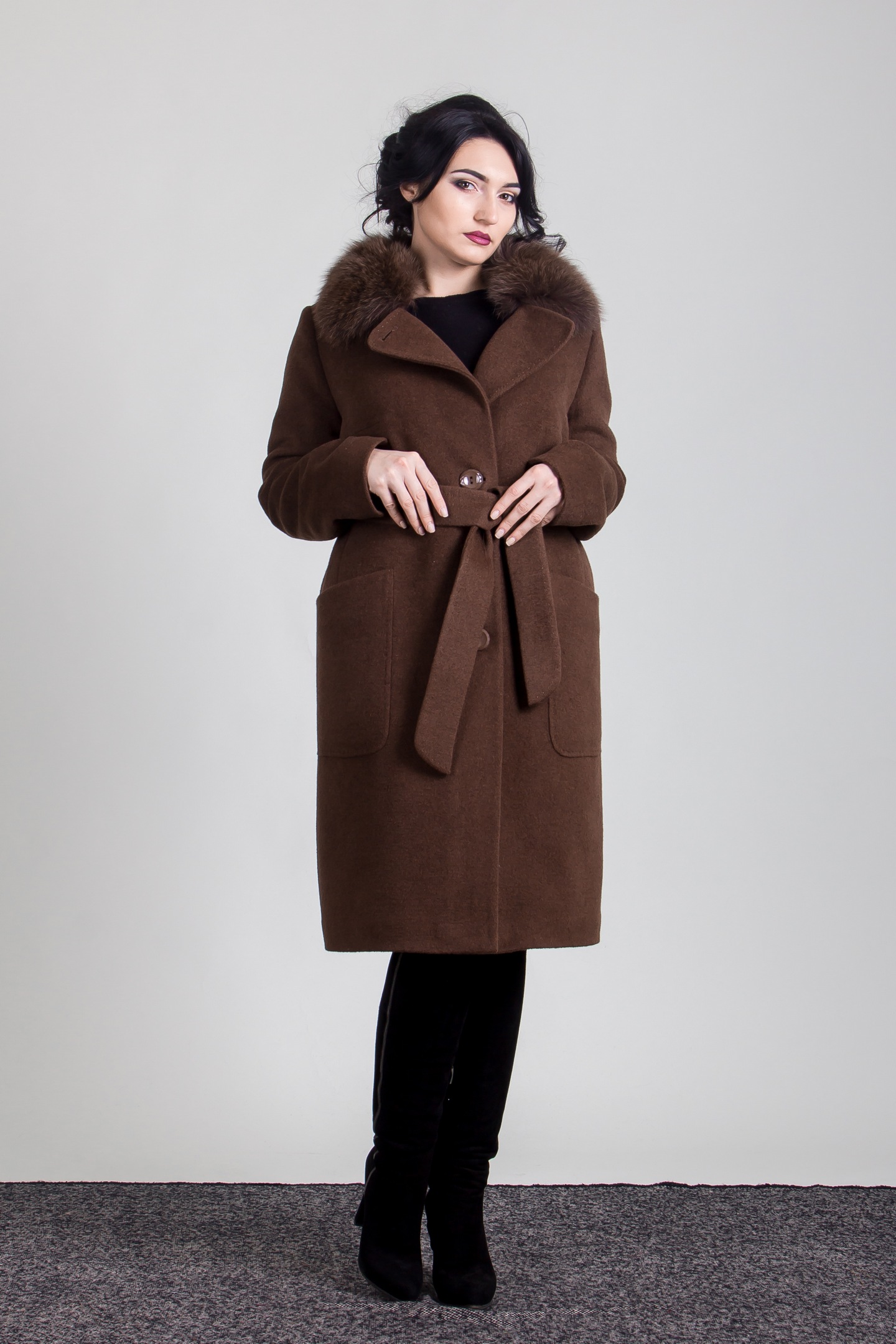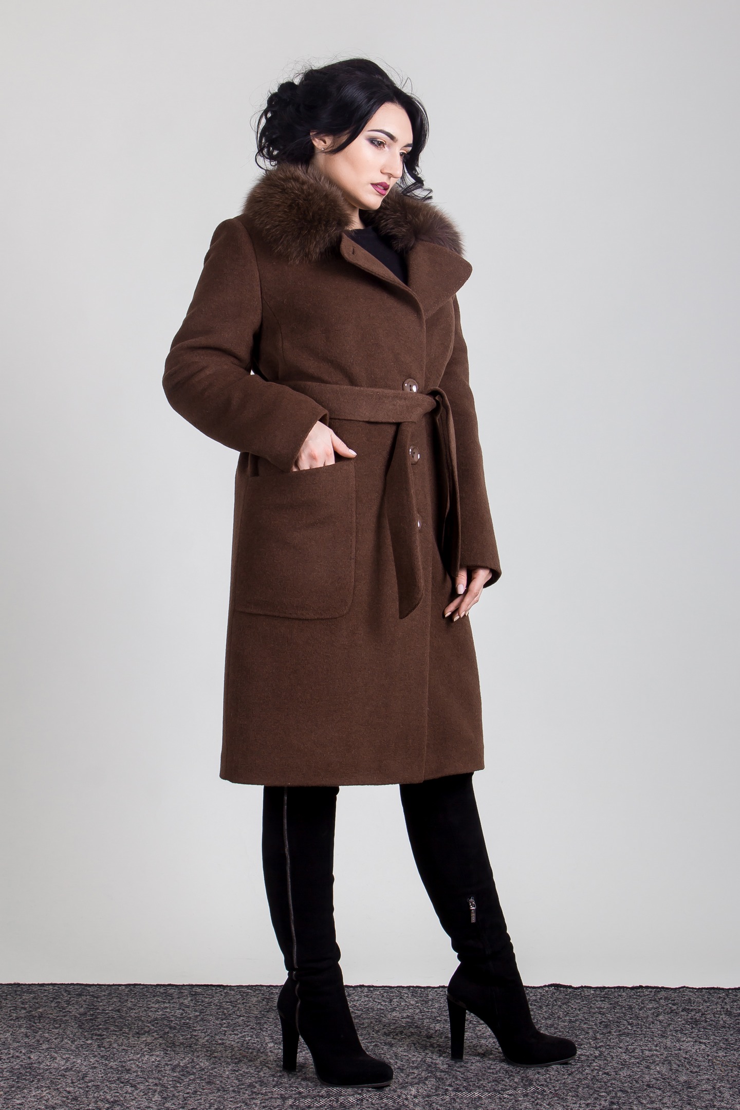 Главное - ткань, решили мы и взялись за высококачественный кашемир. Отложной английский воротник украшен богатым мехом. Накладные карманы по бокам, оригинальная застежка. Любимая многими евро длина. Женственно - с поясом. Молодежно - под джинсы.