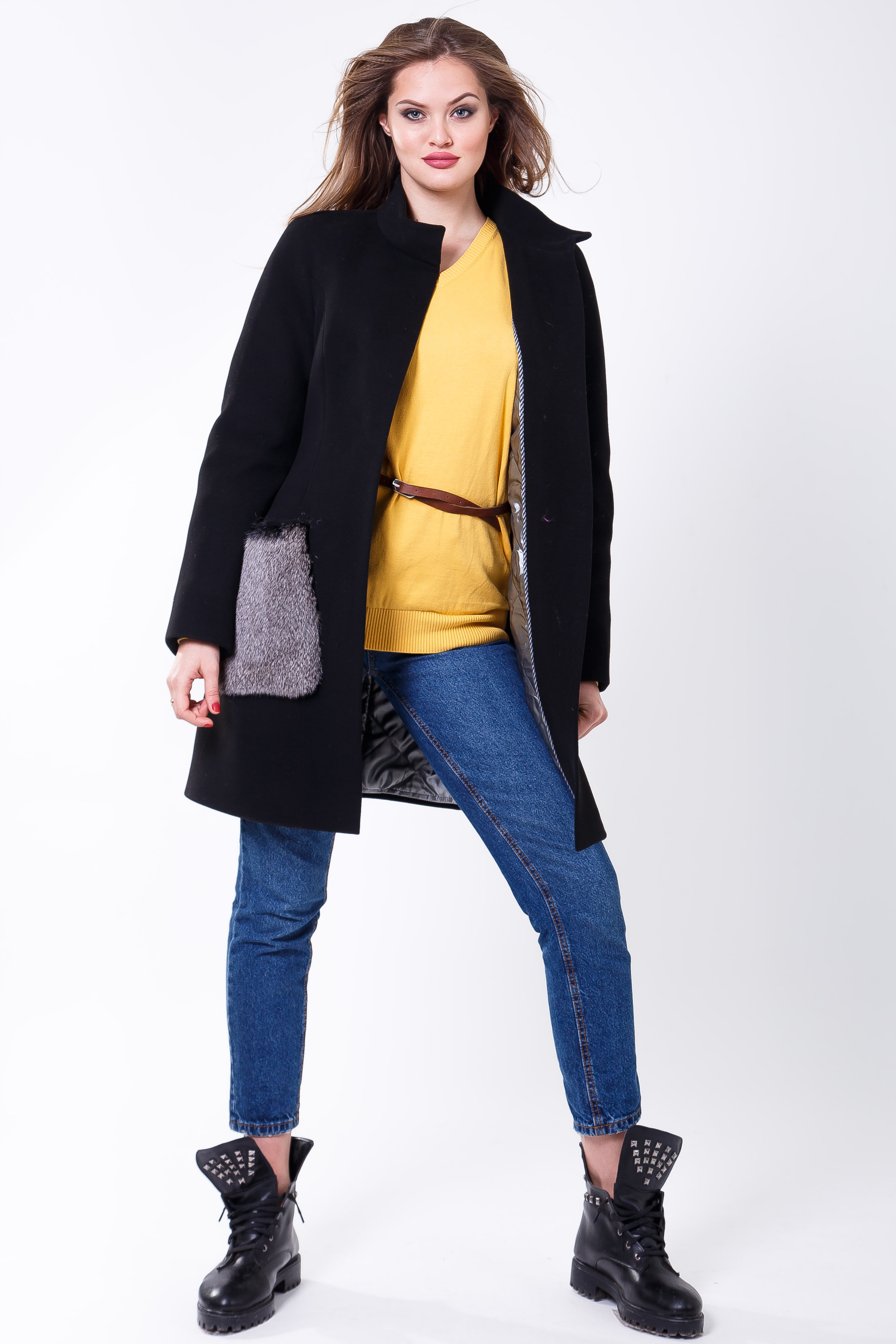 Но совершенной неожиданностью являются большие накладные карманы из коричневого пушистого меха. Такую вещь наденут только модницы-кокетки. И кто тут говорит о строгости?