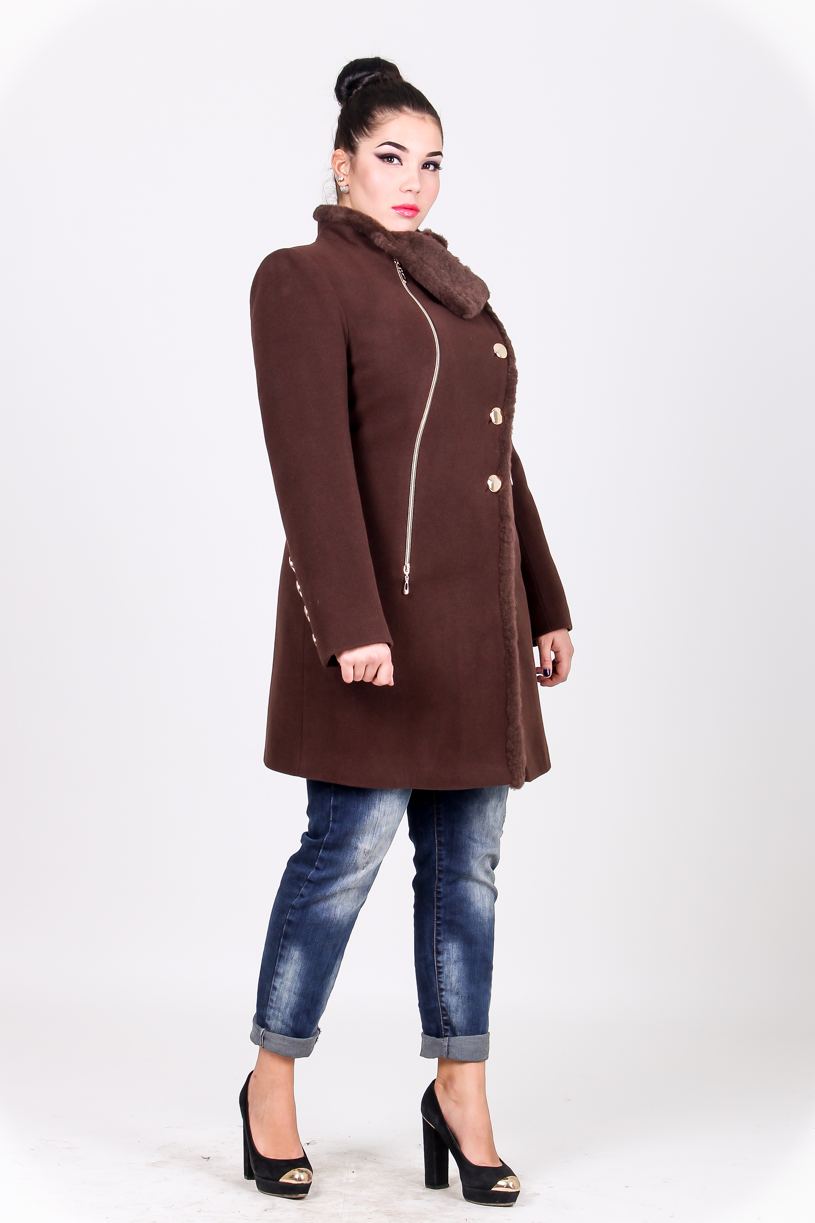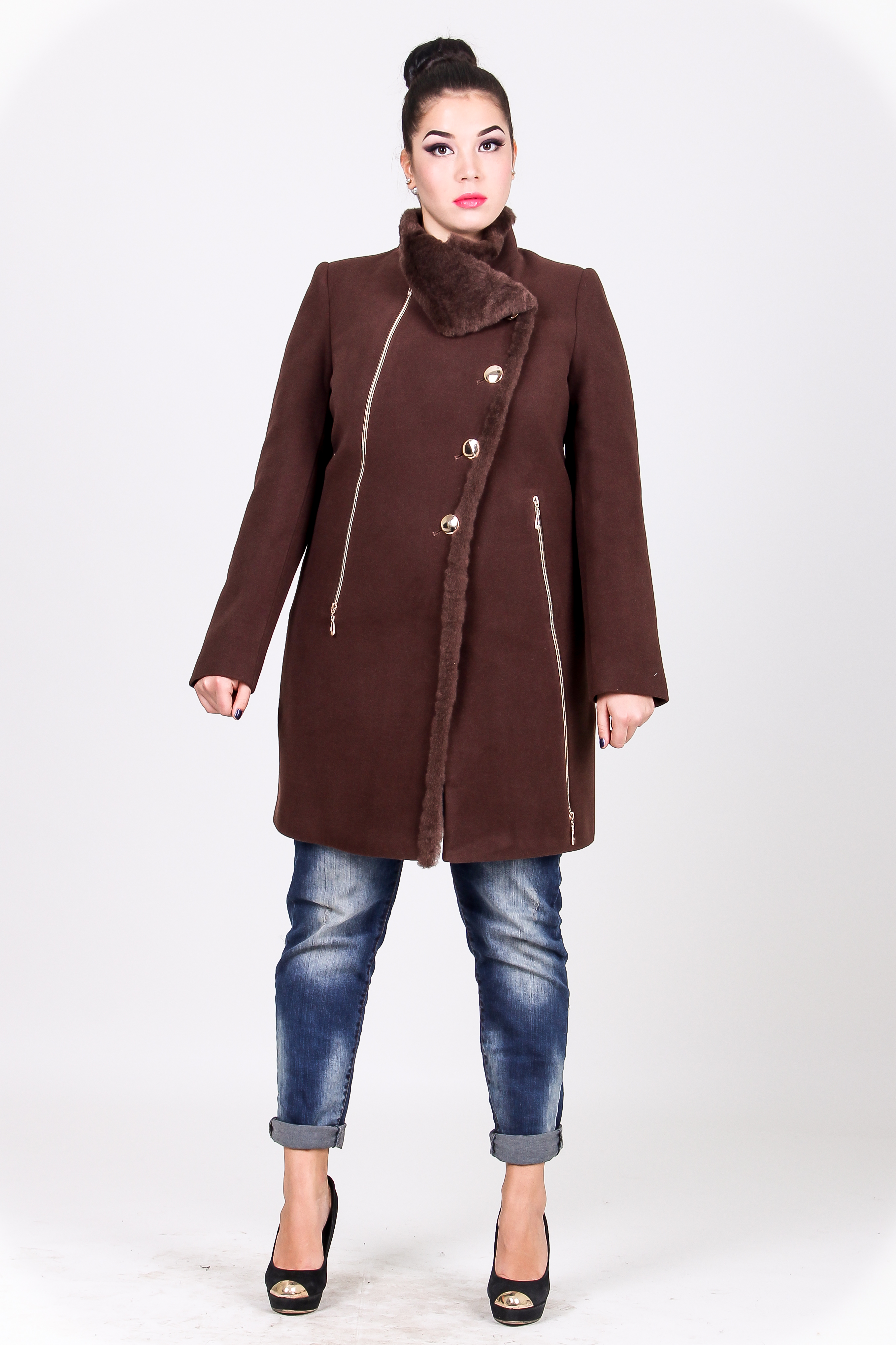 Асимметричная застежка, отделанная мехом полочка, интересное решение воротника. Пуговицы и молнии цвета металлик, легкий намек на любимый всеми бунтарями рокерский стиль. Длина пальто выше колена. Симпатично - под джинсы.