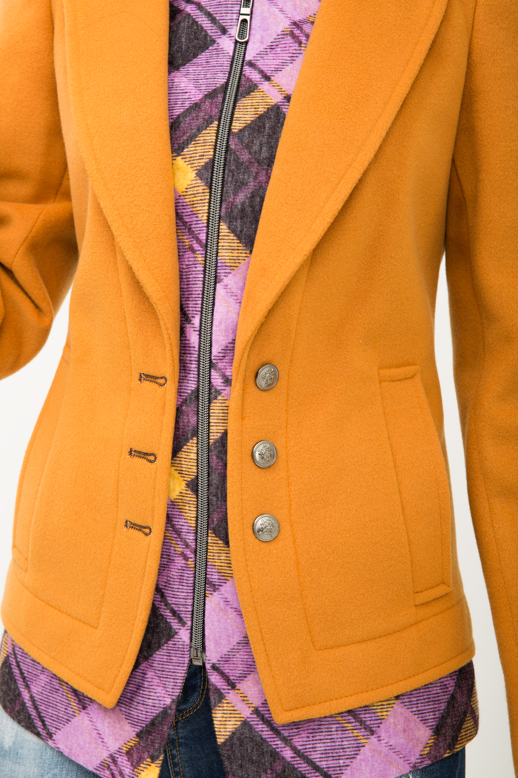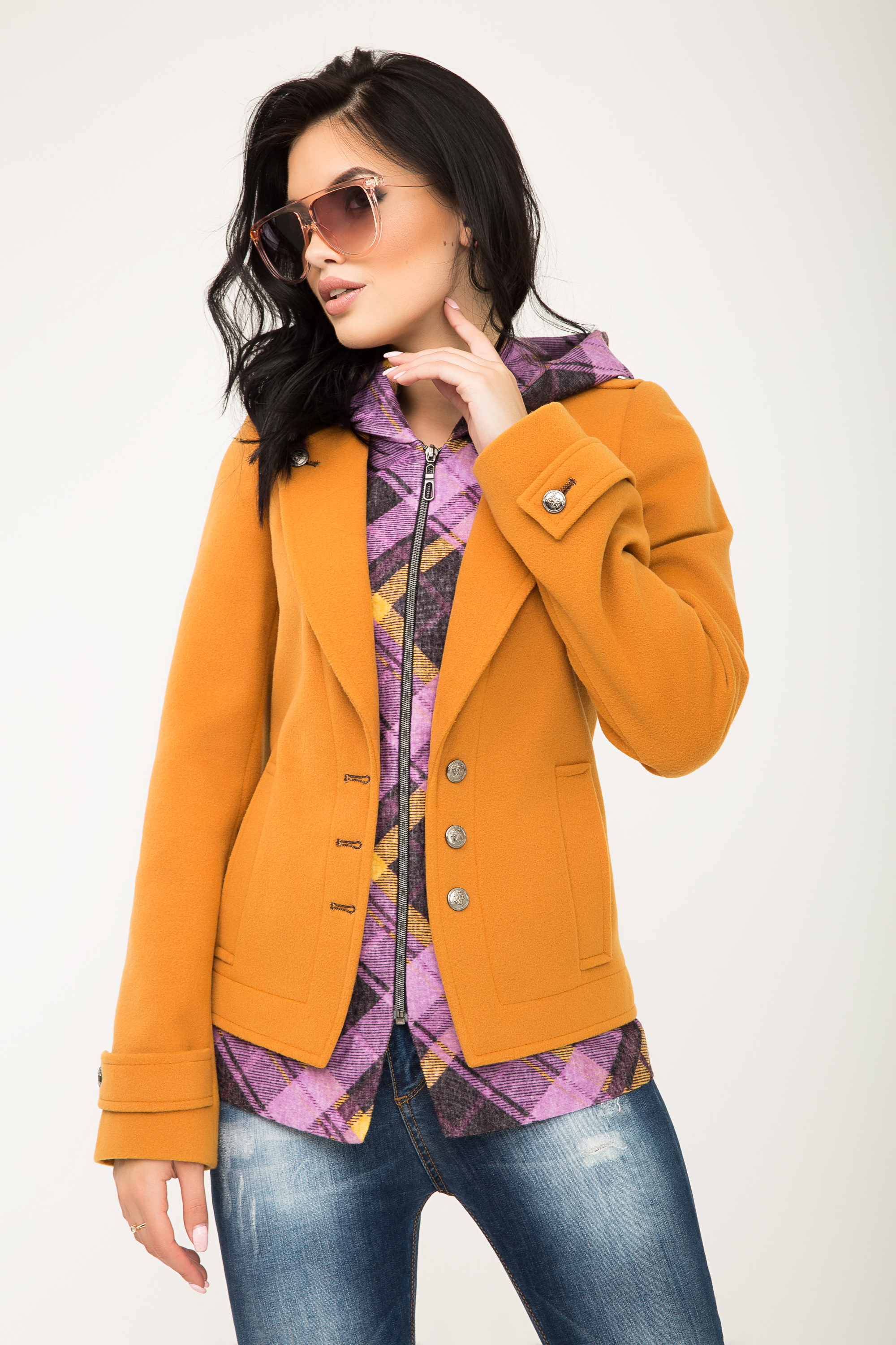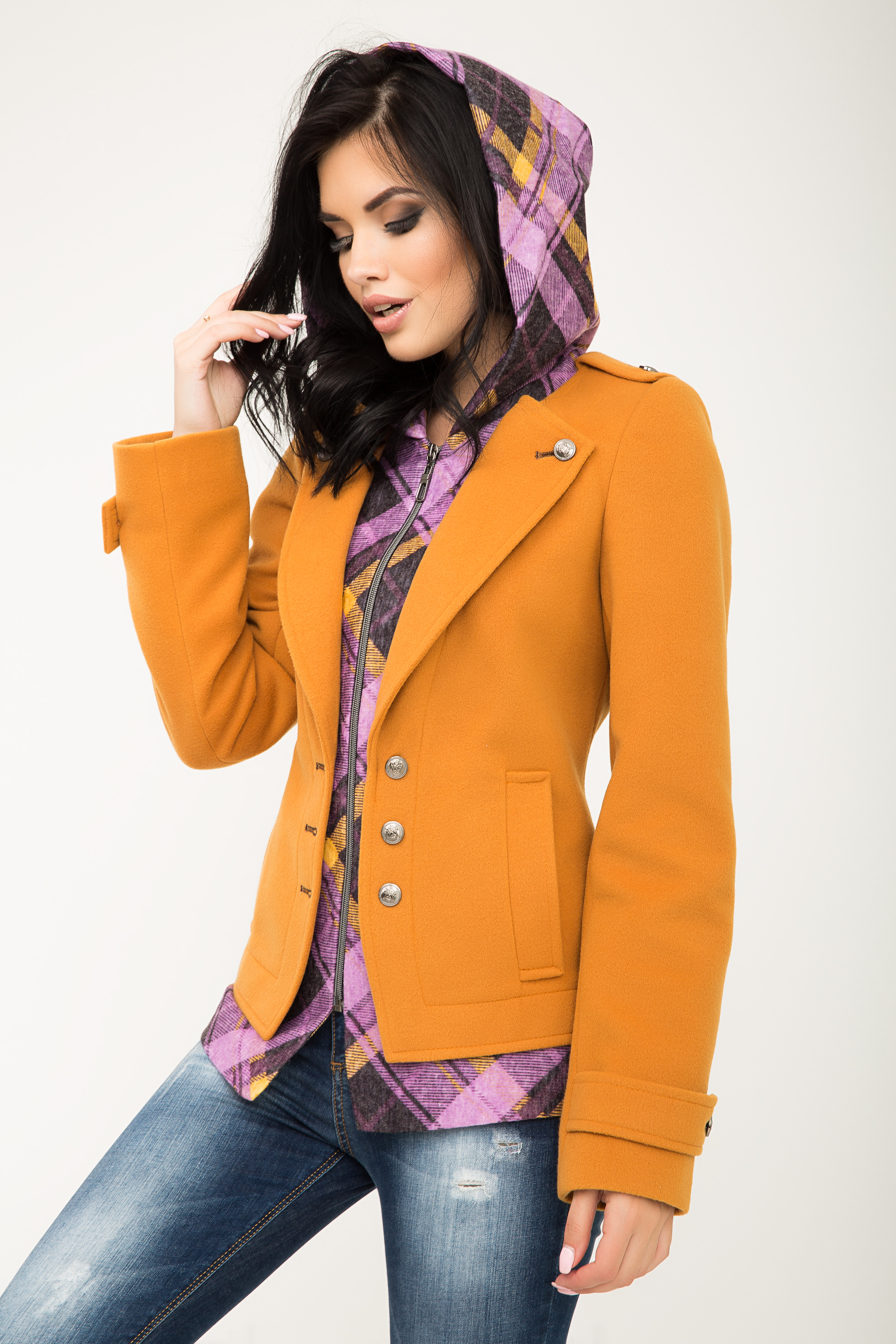 Инновационный фасон создает полную иллюзию трендовой многослойности. Мы видим элегантный английский жакет надетый поверх модной рубашки с капюшоном. На самом деле – это одна вещь; уютная, комфортная и невероятно стильная куртка.