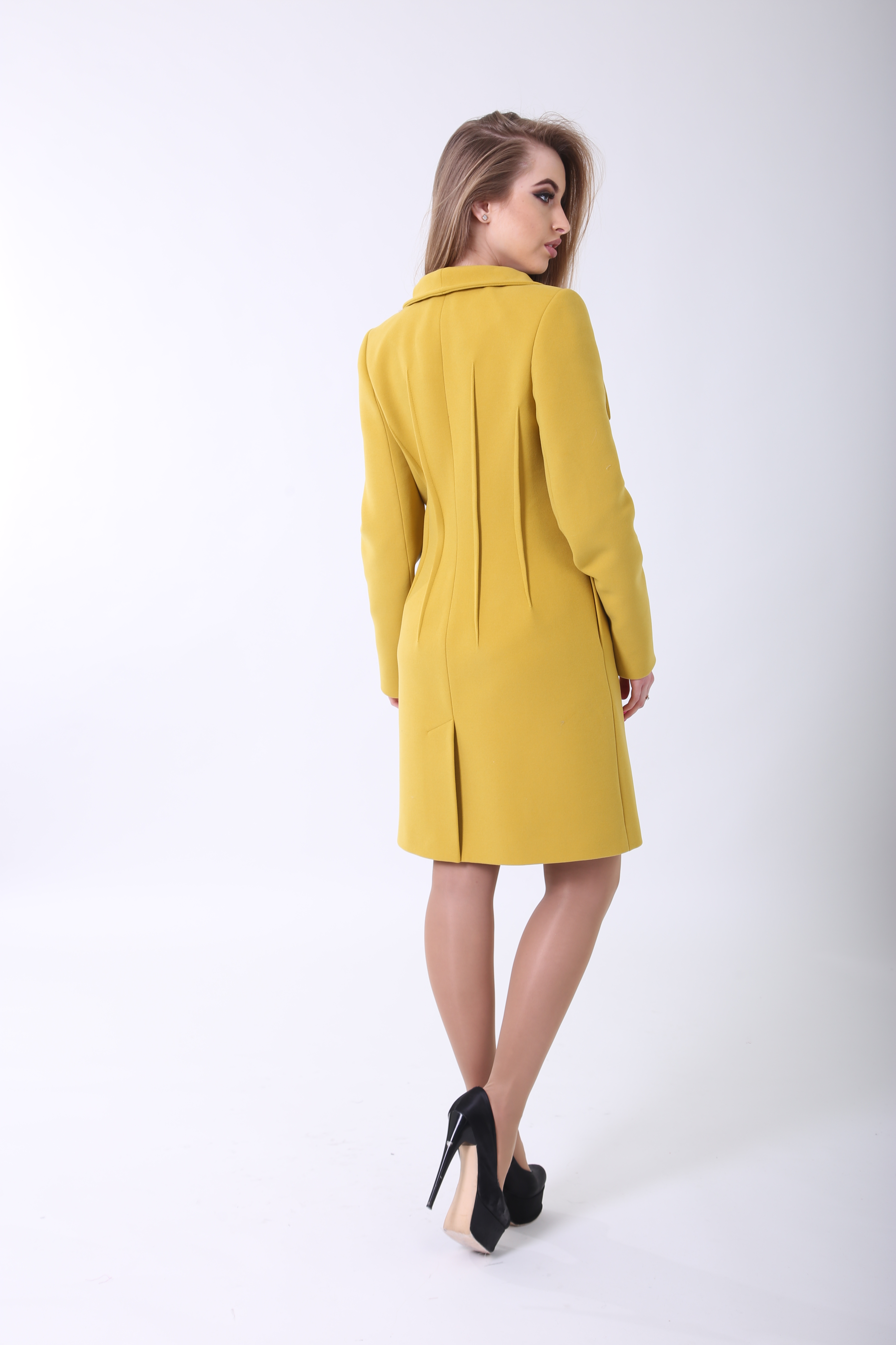 Лаконичный фасон обогащен оригинальной отделкой. Декоративные вытачки наизнанку не только украшают пальто, но и создают выгодный визуальный эффект. Линии значительно сужают талию, вычерчивая силуэт песочные часы.