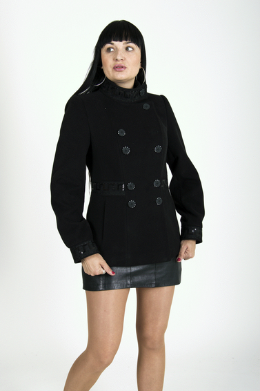 А эта модель просто разрывает все шаблоны. Судите сами. Казалось бы, почти классика: втачной рукав, чёрный цвет и длина чуть выше колена. Но при этом изысканная муаровая ткань на рукавах и кокетке, карманы листочки и отсутствие воротника, что красиво обрисовывает линию шеи и груди.