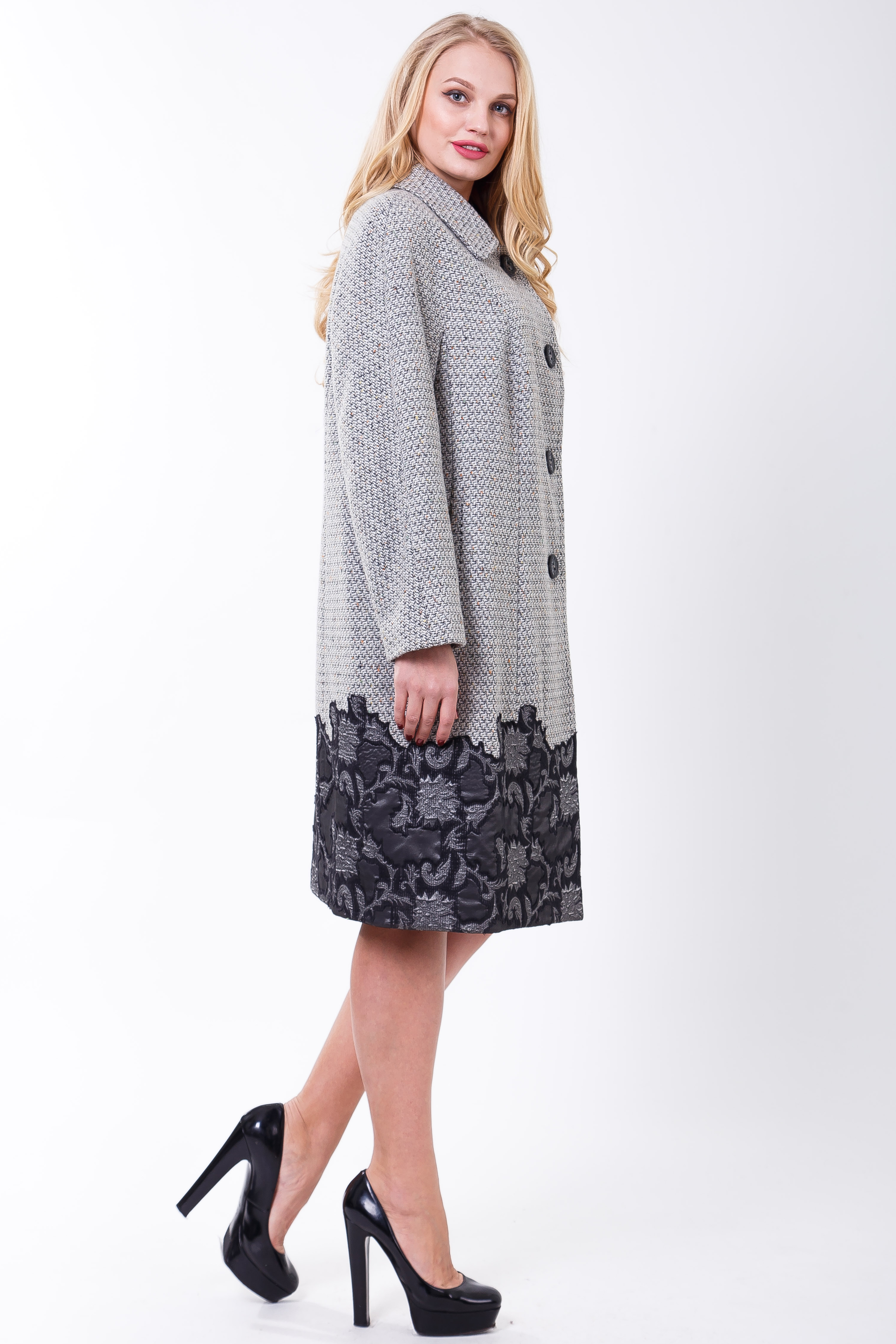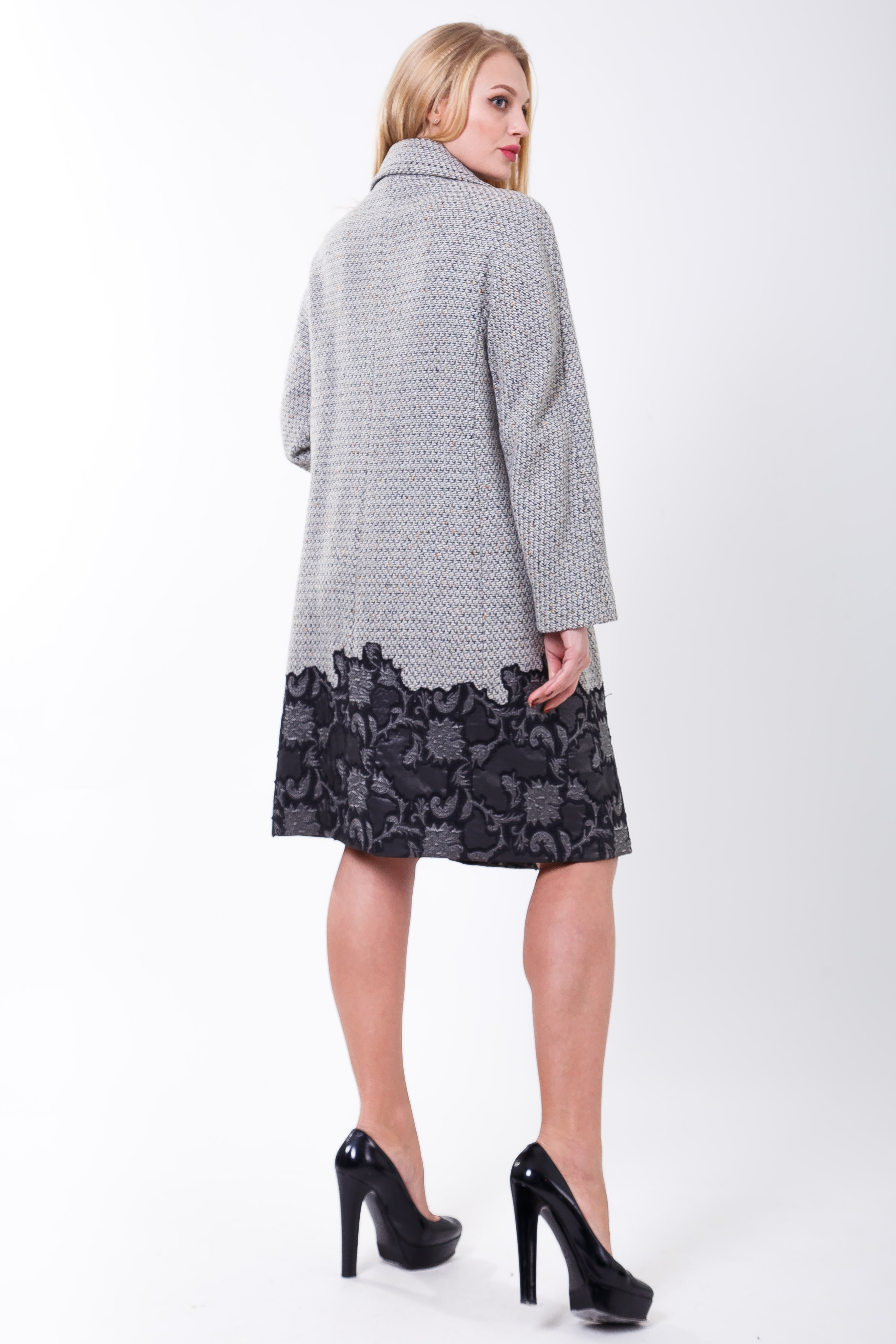 А вот женственности им добавляют оригинальные детали. Такие, как, например, живописная кайма по низу изделия. Рукав реглан, застежка на четыре пуговицы. Благородное сочетание серого с черным довершает изысканный стильный образ. Для респектабельной леди. Идеально под туфли-лодочки.