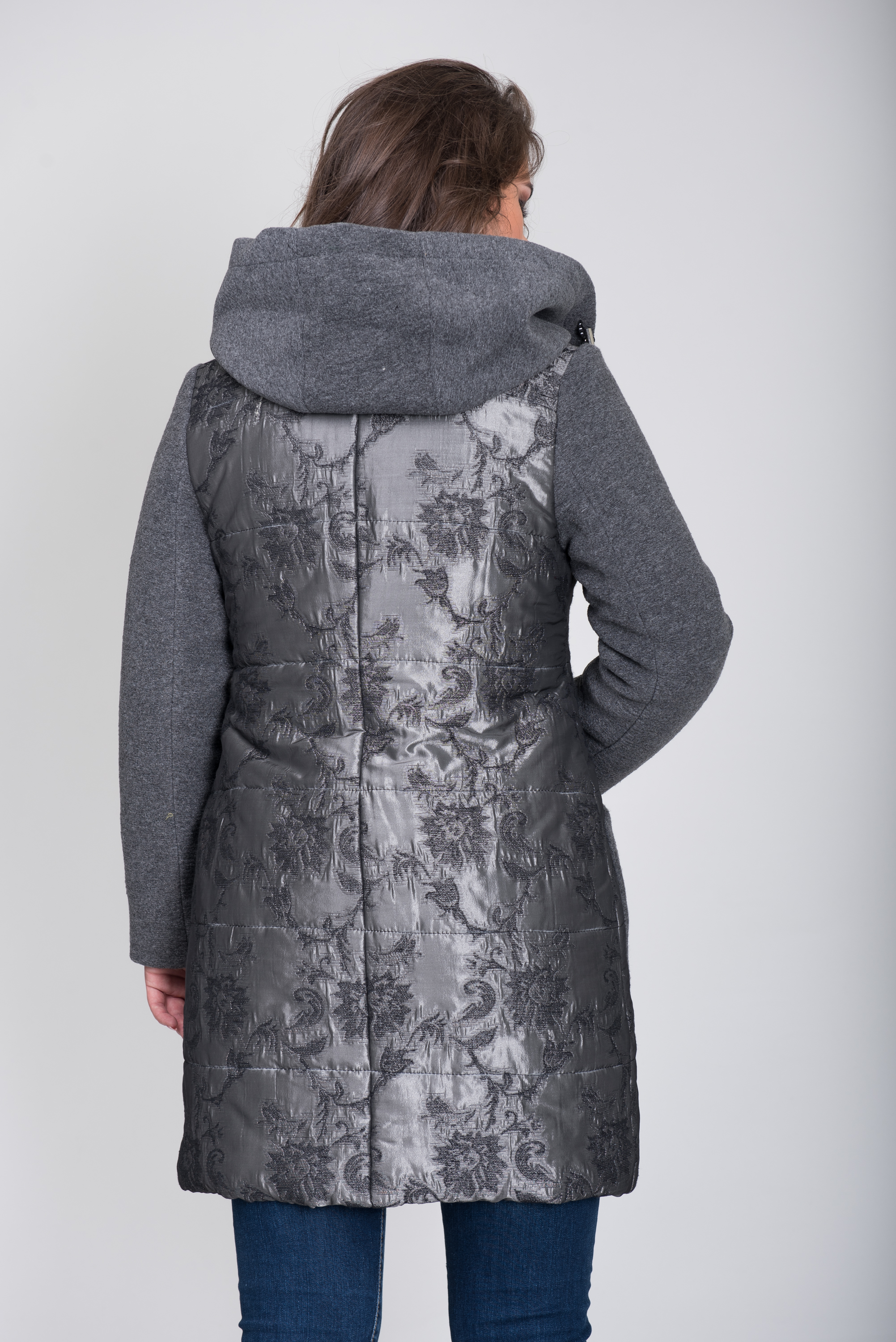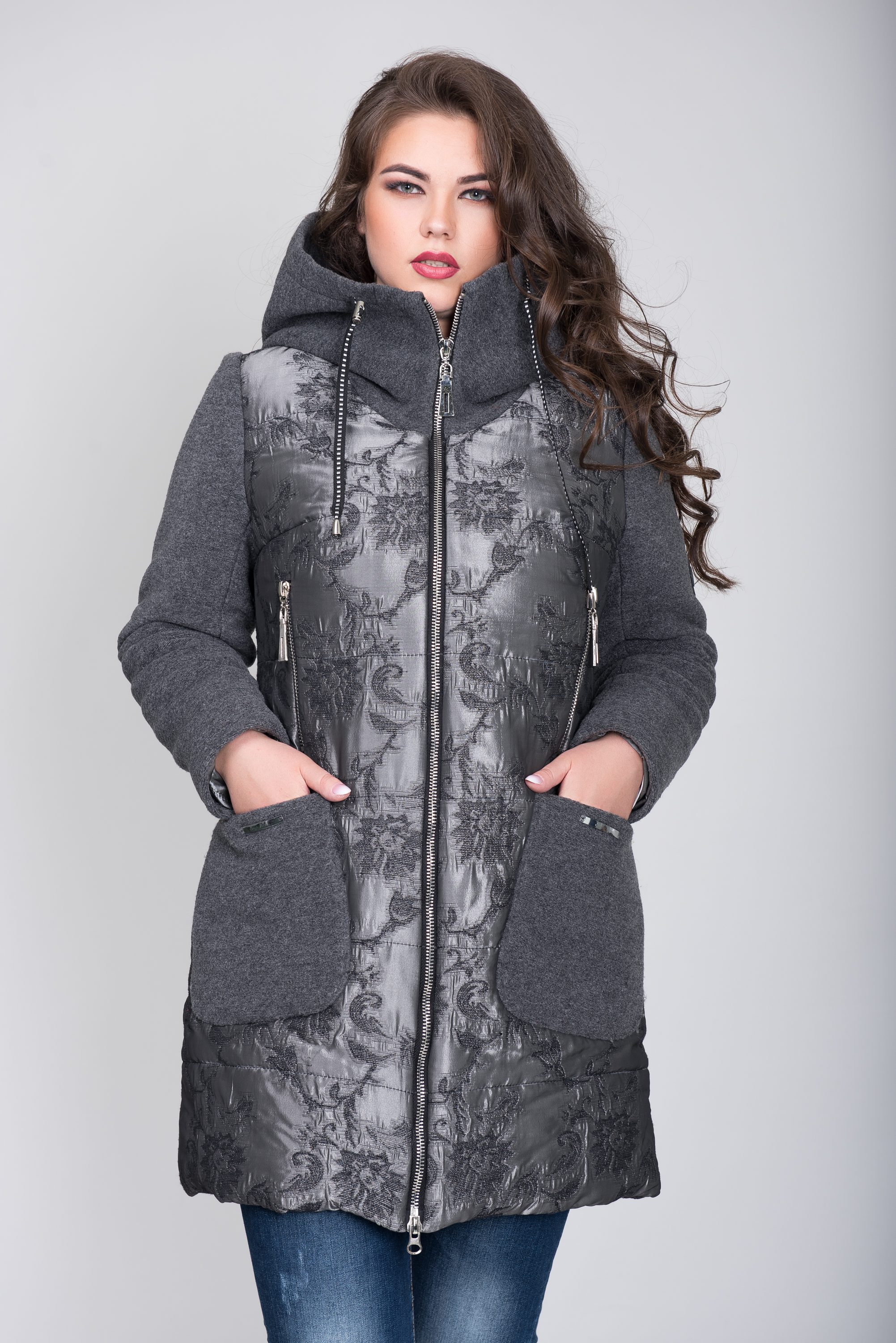 Фасон разработан с учетом последних тенденций и в соответствии с запросами современных модниц. Благодаря гармоничному сочетанию фактур, фигура выглядит легче, а силуэт – стройнее. Модные накладные карманы отлично соседствуют с прорезными, украшенными золотыми молниями. Большой воротник стойка переходит в очень красивый капюшон. Модель сочетается с брюками, юбками и обувью разных стилей.