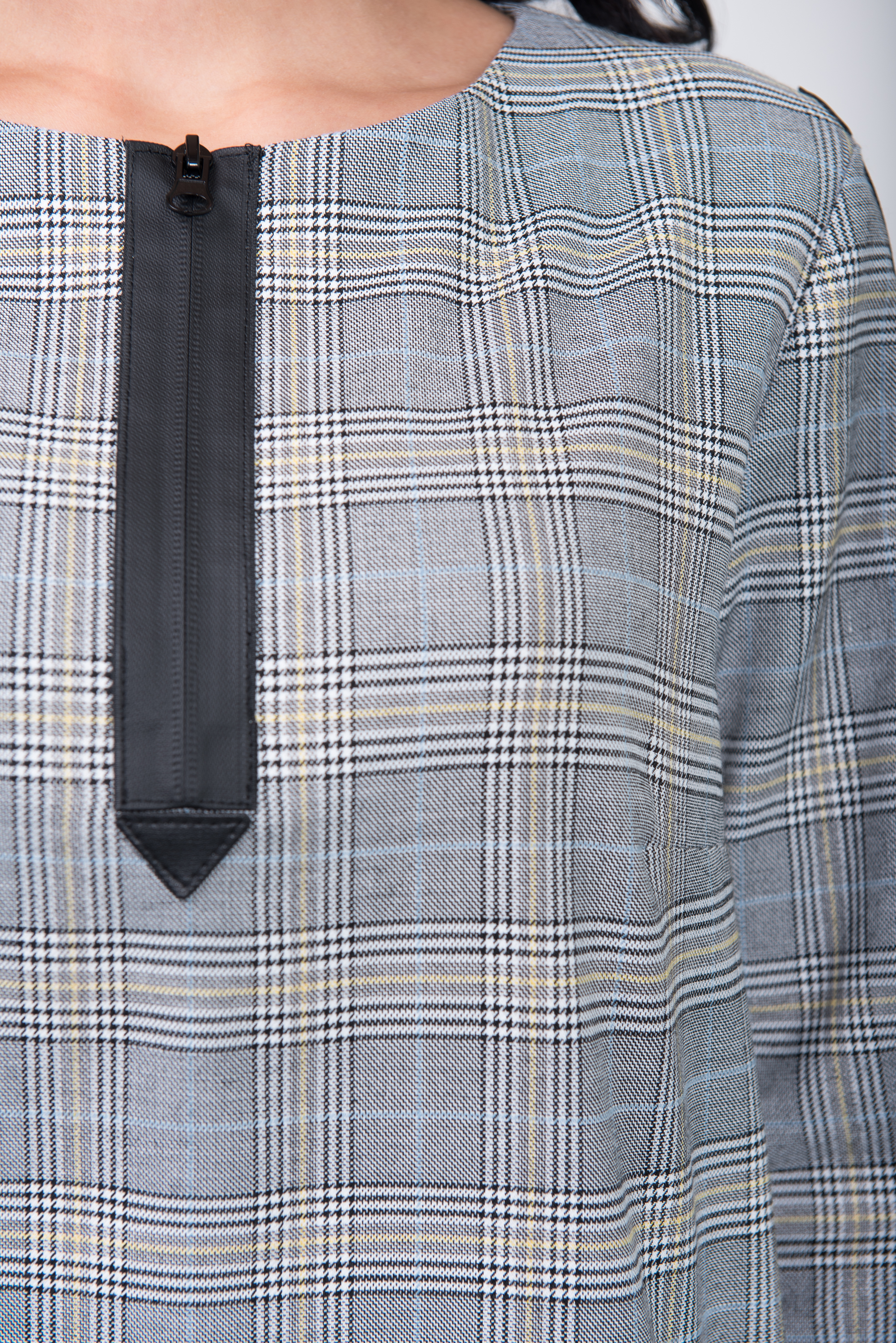Вашему вниманию предлагается укороченная модель в элегантную серую клетку. Круглый вырез, застежка поло и прорезные карманы. Черная отделка и молнии на рукавах добавят образу оригинальности. Хорошо смотрится и под каблук и под обувь на низком ходу.
